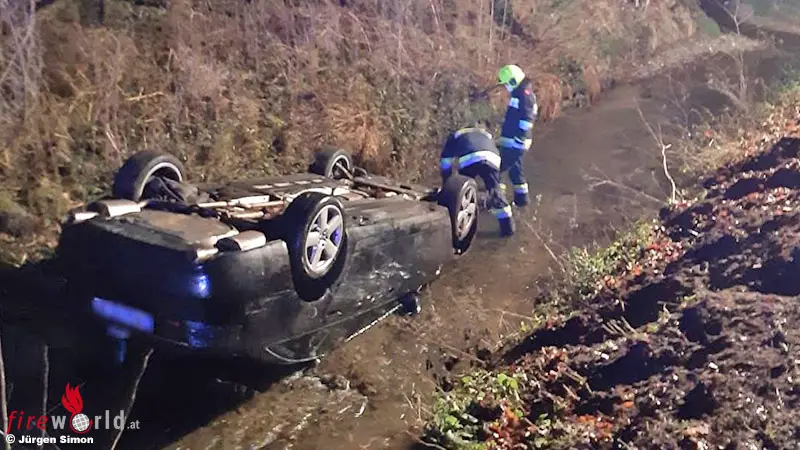 Ein Pkw-Lenker war aus unbekannter Ursache von der Fahrbahn abgekommen und auf dem Dach im Tiefenbach zu liegen gekommen. Die Mitglieder der FF Krumbach bargen das Auto mittels Seilwinde und Umlenkrolle und stellten das Fahrzeug danach gesichert ab.