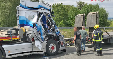 Später rückte ein Bergungsunternehmen an, um mittels Kran den Traktor zu bergen. Eine Fachfirma reinigte die Fahrbahn fachgerecht. Nach über zwei Stunden konnte die Landesstraße für den Verkehr wieder vollständig frei gegeben werden. Neben den beiden Wehren machte sich auch der Gemeindebrandmeister ein Bild von der Einsatzstelle.