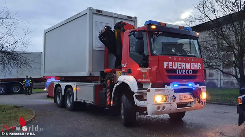 Die Beladung der Feuerwehr-Transportfahrzeuge durch den 40-Tonnen-Kran der Freiwilligen Feuerwehr der Stadt Feldbach erfolgte bereits gestern Nachmittag. Am frühen Abend erfolgte die Verlegung der Einheit nach Lebring, wo die eingesetzten Feuerwehrmitglieder einen Antigen-Test absolvieren mussten.