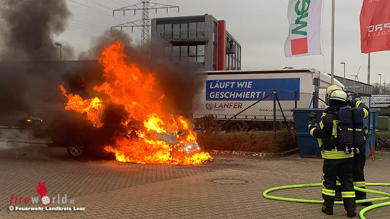 LEER (DEUTSCHLAND): Am Dienstagvormittag, dem 5. Jänner 2021, ist auf dem Parkplatz eines Farbengroßhandels an der Deichstraße in Leer ein Pkw (Range Rover) in Brand geraten. Der Fahrer hatte sich auf einer Probefahrt befunden und den Wagen nur wenige Minuten vor dem Großhandel abstellt.