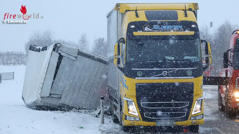 Oö: Lkw-Anhänger bei winterlichen Bedingungen auf Voralpenstraße bei Sattledt umgestürzt