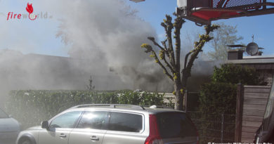 Da zu diesem Zeitpunkt davon ausgegangen werden musste, dass sich noch eine Person im Gebäude aufhielt wurde entsprechend mit den Zusatz „Menschenleben in Gefahr“ alarmiert. Binnen weniger Minuten waren erste Einsatzkräfte aus Vellage und Weener vor Ort. Beim Eintreffen stand der Dachstuhl bereits in Vollbrand, Flammen schlugen aus dem Dach.