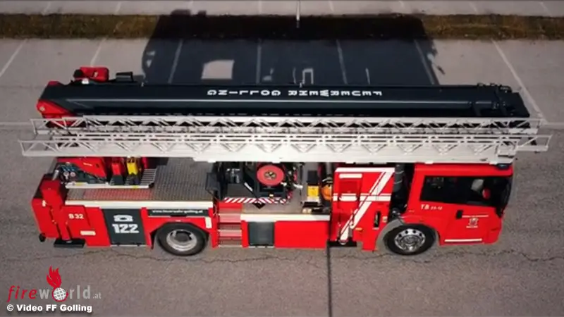 GOLLING (SBG): Am 23. Dezember 2020 stellte die Freiw. Feuerwehr Golling ihre neue Teleskopmastbühne in den Dienst. Das „neue“ Fahrzeug ist ein drei Jahre altes Vorführfahrzeug der Firma Rosenbauer auf einem Mercedes-Benz Econic Fahrgestell.