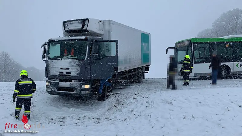 KRUMBACH (NÖ): Am 9. Februar 2021 wurde die Freiw. Feuerwehr Krumbach zu einer Lkw-Bergung auf die Hochneukirchenstraße nähe Möltern gerufen. Ein Lkw-Fahrer kam auf Grund der Schneefahrbahn quer auf der Hochneukirchenstraße zu stehen und sperrte diese.