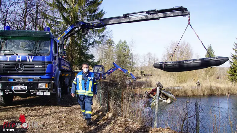 ANGER (BAYERN): Am Samstag, den 20. Februar 2021, wurde der THW Ortsverband Berchtesgadener Land zu einem Einsatz in Vachenlueg gerufen. Zuvor war ein 8-Tonnen-Radbagger des Typs „Fuchs 301“ in ein Fischzuchtgewässer gestürzt. Der Fahrer konnte noch aus dem kopfüber im vereisten Weiher versinkenden Gefährt heraustauchen.