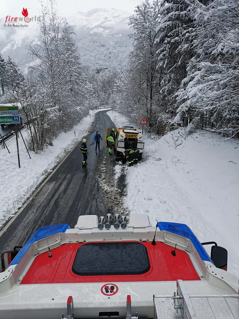 Nach dem Eintreffen der Hauptfeuerwache Bad Ischl wurde mittels der Seilwinde des schweren Rüstfahrzeuges der Lkw wieder auf die B145 gezogen. Nachdem ein Räumfahrzeug die Straße auf den besagten 1,5km durchgeräumt und –gestreut hatte, konnte man wieder in die Zeugstätten einrücken.