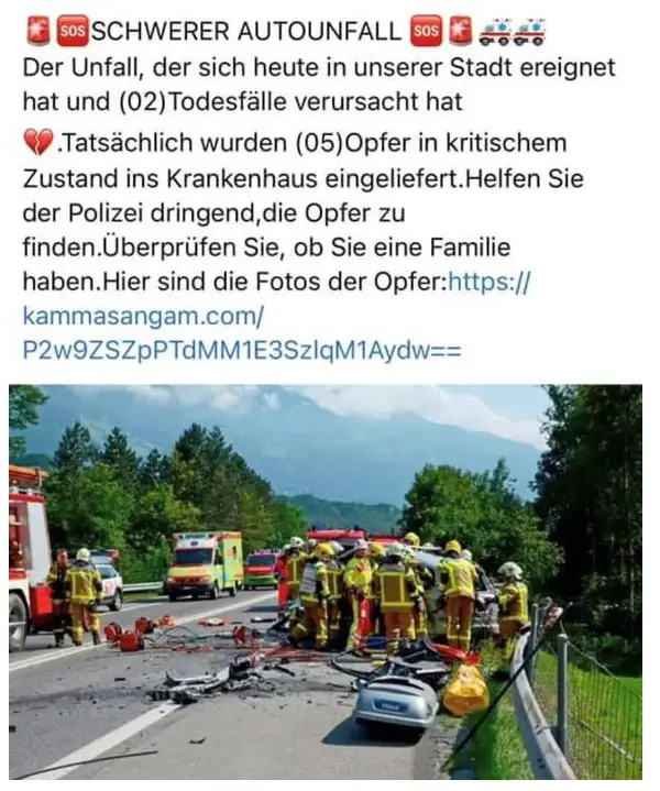 Die Polizei in Zug (Schweiz) warnt derzeit von einem Posting, das durch die sozialen Netzwerke geht. Sie zeigt einen schweren Unfall und ruft dazu auf, die Meldung zu lesen, um mitzuhelfen, die fünf überlebenden Opfer zu identifizieren. Zwei weitere Menschen seien tot.
