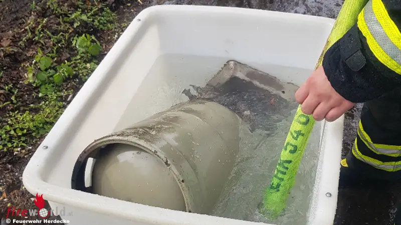 Die Feuerwehr sicherte den Einsatzort durch Sperrung. Aus der Deckung wurde die brennende Gasflasche herunter gekühlt. Anschließend wurde sie weiter in einem Wasserbad herunter gekühlt. Ein Löschzug war 60 Minuten im Einsatz.