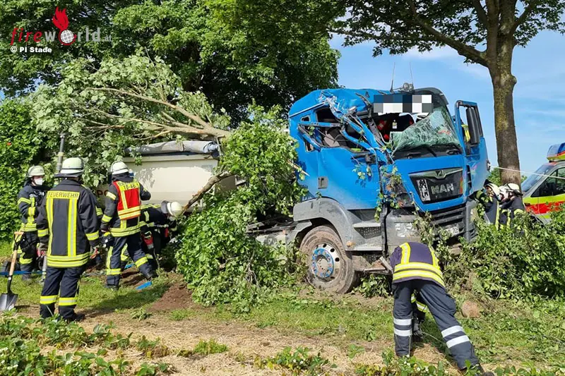 Der Fahrer musste durch die eingesetzten Feuerwehrleute aus Nottensdorf, Apensen, Hedendorf und von der Besatzung des Rüstwagens der Feuerwehr Buxtehude aus der Zugmaschine befreit werden, weil sich die Tür durch den Aufprall auf Bäume und Buschwerk nicht öffnen ließ. Er wurde nach der Erstversorgung durch den Buxtehuder Notarzt und die Besatzung eines Rettungswagens mit schweren Verletzungen ins Buxtehuder Elbeklinikum eingeliefert.