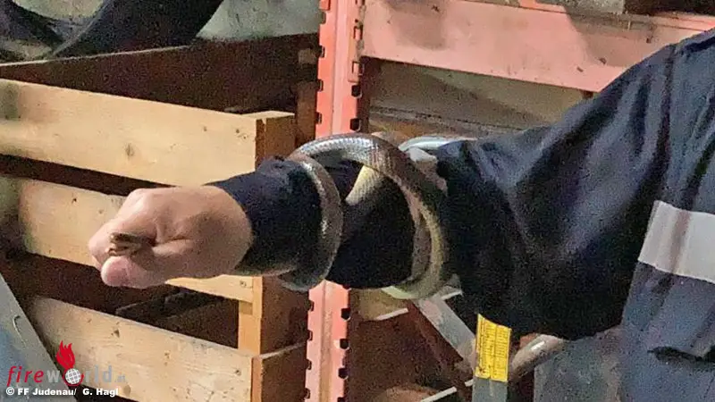 JUDENAU-BAUMGARTEN (NÖ): Am Donnerstagabend, 10. Juni 2021, ersuchte der Ortsvorsteher von Judenau um Unterstützung, da eine Schlange sich in ein Haus geschlichen hatte.