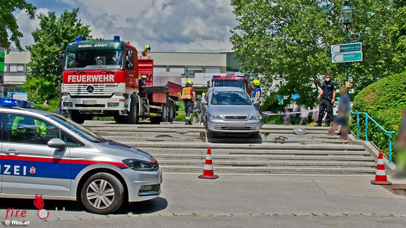 BADEN (NÖ): Eine Pensionistin soll gerade auf der Suche nach einem Parkplatz gewesen sein, als sie sich in der Badener Innenstadt am Brusattiplatz mit ihrem Opel verfahren hatte und auf dem Stiegenaufgang beim Kurmittelhaus/Parkdeck Römertherme zum Stehen kam.