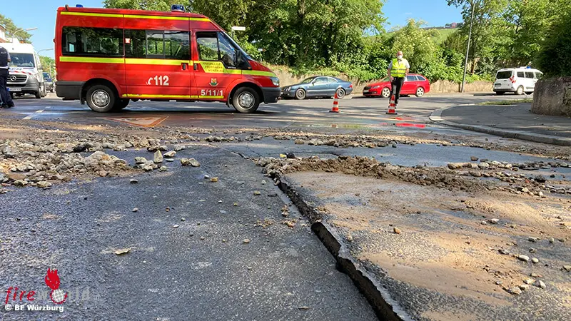 WÜRZBURG (BAYERN): Zu einem größeren Wasserrohrbruch ist es am Montagnachmittag, 21. Juni 2021, in Heidingsfeld in Würzburg gekommen. Dabei wurde die Straße um mehrere Zentimeter angehoben und teilweise Keller unter Wasser gesetzt.