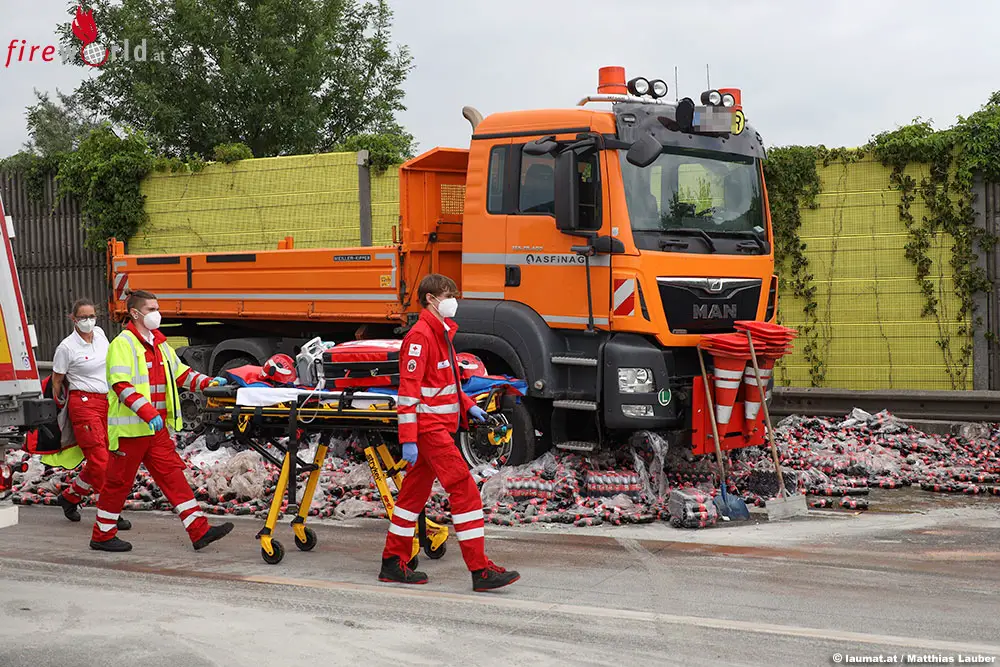 Die Getränkeladung des Schwerfahrzeuges stürzte teilweise auf die Fahrbahn. Die Feuerwehr musste die Getränke beiseite schaffen. Der Lkw musste von einem Bergeunternehmen abtransportiert werden. Der verletzte Unfalllenker wurde nach notärztlicher Erstversorgung mit dem Notarzthubschrauber Christophorus 10 ins Krankenhaus geflogen.