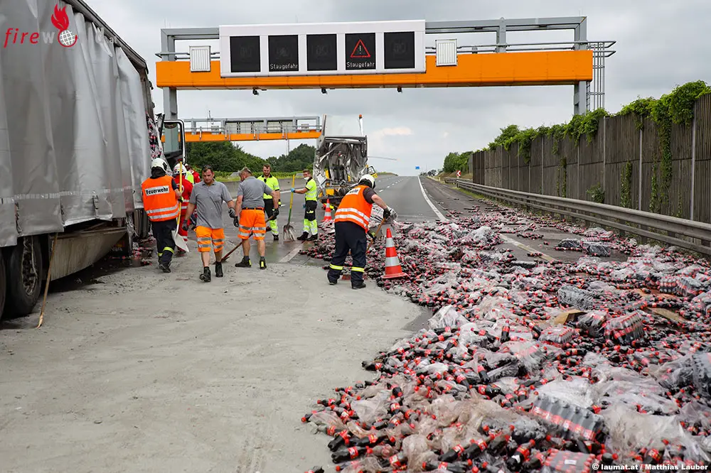 Die Getränkeladung des Schwerfahrzeuges stürzte teilweise auf die Fahrbahn. Die Feuerwehr musste die Getränke beiseite schaffen. Der Lkw musste von einem Bergeunternehmen abtransportiert werden. Der verletzte Unfalllenker wurde nach notärztlicher Erstversorgung mit dem Notarzthubschrauber Christophorus 10 ins Krankenhaus geflogen.