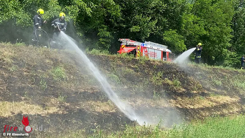 EBENFURTH (NÖ): Zum ersten Einsatz des 24. Juni 2021 wurden die ehrenamtlichen Kameraden kurz nach 12 Uhr alarmiert. Auf einem Hochwasserdamm war auf einer Länge von knapp 60m ein Flächenbrand ausgebrochen. Gemeinsam mit der FF Haschendorf wurde der Brand mit mehreren Löschleitungen bekämpft.