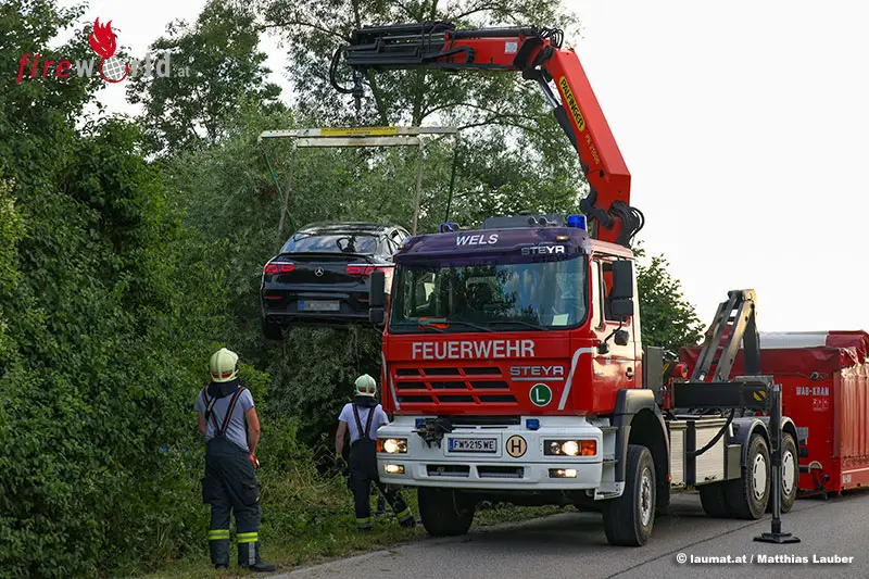 WELS-WAIDHAUSEN (OÖ): Ein Auto wäre Freitagabend, den 2. Juli 2021, in Wels-Waidhausen bei einem Verkehrsunfall beinahe in einem Teich beziehungsweise dem Zeilinger Bach gelandet.