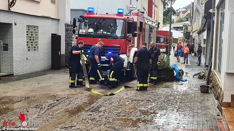 Seit den Vormittagsstunden arbeiten die Züge 33 und 34 des Paderborner Verbandes als erste auswärtige Feuerwehr in der Innenstadt von Altena. „Überall werden wir mit hochgerecktem Daumen begrüßt“, freut sich Keuter. Die Einsatzkräfte befreien die Straßen von Schlamm und Geröll und haben bereits 30 Keller ausgepumpt.