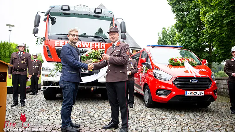 MOOSBACH (OÖ): Am Sonntag, den 11. Juli 2021, konnte endlich die Segnung der beiden neuen Fahrzeuge und des Notstromerzeugers abgehalten werden. Unter strenger Einhaltung der Coronaregeln bekamen das im vorigen Jahr in Dienst gestellte „Mannschaft Transport Fahrzeug“ kurz MTF und das erst seit kurzer Zeit im Dienst befindliche Notstromaggregat und natürlich das neue Tanklöschfahrzeug, kurz TLF-A 4000, den kirchlichen Segen.