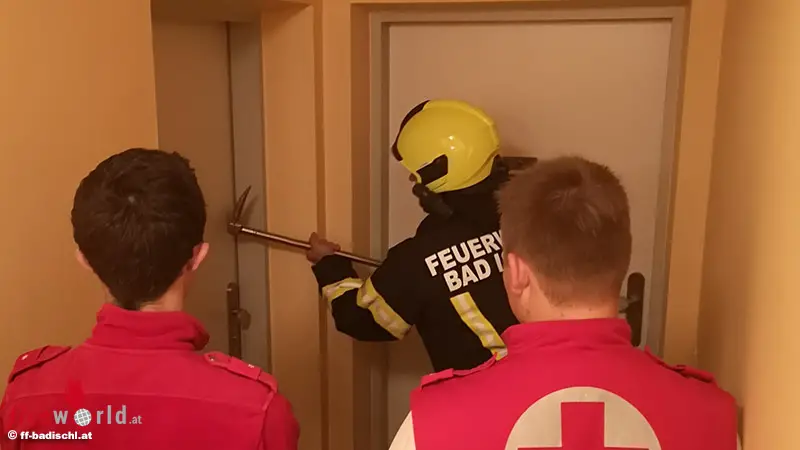 Die anwesenden Sanitäter vom Roten Kreuz veranlassten die Alarmierung der Feuerwehr und der Polizei. Nachdem ein Zugang in die Wohnung über ein Fenster mit der Drehleiter nicht möglich war, musste die Haustüre mittels Spezialwerkzeug gewaltsam geöffnet werden. Die verletzte Person wurde von den Sanitätern erstversorgt und ins Krankenhaus Bad Ischl zur weiteren Behandlung verbracht. Kurz nach 20:00 Uhr war der Einsatz für die beteiligten Kräfte wieder beendet.
