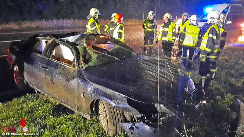 WIENER NEUSTADT (NÖ): Zu einem Verkehrsunfall mit Menschenrettung wurde die Freiwillige Feuerwehr in der Nacht auf Sonntag, 25. Juli 2021, alarmiert. Obwohl sich das Unfallfahrzeug bei schwerem Regen mehrfach auf der nassen Fahrbahn überschlug, hatte der Lenker großes Glück. Er konnte sich selbstständig aus dem Unfallfahrzeug befreien und blieb unverletzt.