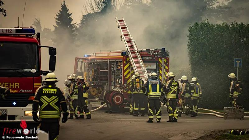 BOCHOLT (DEUTSCHLAND): Die Feuerwehr Bocholt war am Nachmittag des 3. August 2021 mehrere Stunden im Einsatz, um ein Feuer in einem Wohnhaus mit angrenzendem Gewerbebetrieb zu löschen. Die Bewohner des Wohnhauses waren glücklicherweise nicht zu Hause. Vorsorglich wurden Anwohner über Radiodurchsagen und der Warn-App NINA aufgefordert Fenster und Türen zu schließen. Eine weitere Gefahr für die Umgebung bestand jedoch nicht.