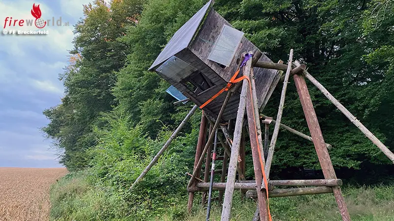 BRECKERFELD (DEUTSCHLAND): Im Bereich Kotten geriet am frühen Dienstagmorgen ein Jäger auf seinem Hochsitz in eine Notlage. Der Hochsitz brach in etwa 3 Metern Höhe im vorderen Bereich ab und drohte abzustürzen.