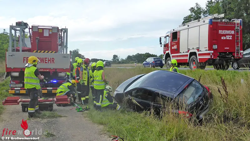 GROSSWEIKERSDORF (NÖ): Am 3. August 2021 um 17:54 Uhr wurde die Freiwillige Feuerwehr Großweikersdorf von Florian Niederösterreich mittels Pager und Blaulicht-SMS mit dem Alarmtext „Technischer Einsatz für die Feuerwehr Großweikersdorf, Verkehrsunfall auf der LB4, in Richtung Kleinwetzdorf, ein Pkw im Graben.“ alarmiert.