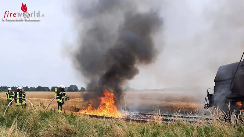 HELVESIEK (DEUTSCHLAND): Am Freitagmittag, den 13. August 2021, wurden die Ortsfeuerwehren aus Scheeßel und Westervesede zur nachbarschaftlichen Löschhilfe nach Helvesiek alarmiert. Dort war beim Abernten eines Getreidefelds der Mähdrescher in Brand geraten.
