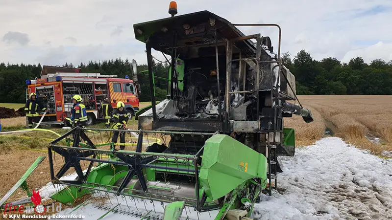 NEGENHARRIE (DEUTSCHLAND): Am Samstag 14. August 2021, kam es um ca.15:45 Uhr zu einem Mähdrescherbrand auf einem Getreidefeld in Negenharrie, Ortsteil Ovendorf. Das Feuer ging auf das Feld über und vernichtete ca. 3-4ha Strohfläche.