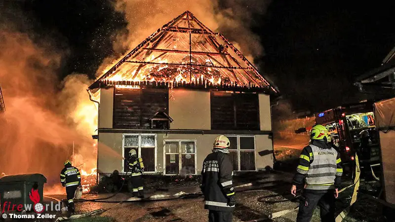 „Meterhohe Flammen und dichte Rauchschwaden schlugen den 129 eingesetzten Feuerwehrmänner schon während der Anfahrt entgegen“, schildert Einsatzleiter Hauptbrandinspektor Edwin Hatz. Als einer der ersten Maßnahmen der Einsatzkräfte war es, das angrenzende Wohnhaus vor den in Vollbrand stehenden Wirtschaftsgebäuden zu schützen, so Hauptbrandinspektor Hatz weiter.
