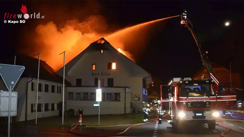 Am Samstag, 21. August, gegen 00.50 Uhr, ging bei der Kantonalen Alarmzentrale die Meldungen ein, dass es im Restaurant Bad Klus in Oensingen brennt. Als die Patrouille vor Ort eintraf, konnten im Gebäudeinneren Flammen festgestellt werden. Rasch breitete sich das Feuer auf den gesamten Dachstock aus.