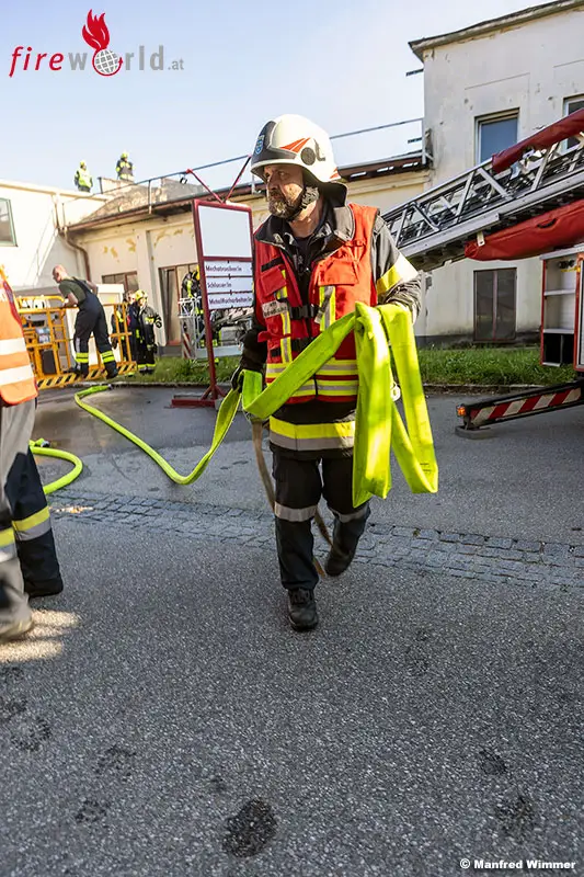 Rasch rückten die Fahrzeuge der Feuerwehr Statzendorf zum Brandeinsatz aus. Vor Ort wurde unverzüglich eine Löschleitung zur Bekämpfung des Brandes in Angriff genommen. Am Dach einer Halle kam es vermutlich durch Heißarbeiten zu einem Entstehungsbrand, der sich rasch ausbreitete.