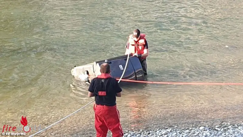 STEYR (OÖ): Am 6. September 2021 wurde wieder einmal eine 1.100 Liter Mülltonne von Unbekannten in die Steyr geworfen. Um die Tonne zu bergen, rückte der Wasserzug und der Technische Zug der Freiwilligen Feuerwehr Steyr aus.