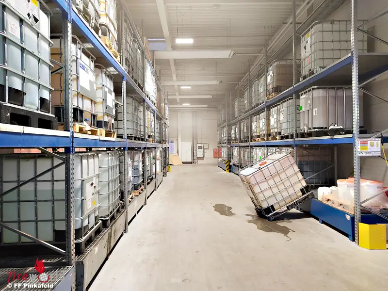 Der Tank wurde dabei undicht und Säure trat aus. Ein Arbeiter wurde durch die Säuredämpfe bewusstlos. Sofort wurde vom ULF ein Atemschutztrupp zur Menschenrettung in die Lagerhalle geschickt. Die Mannschaft des RLF baute parallel zur Menschenrettung einen Behelfs-Dekoplatz auf.