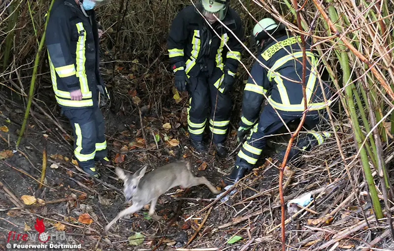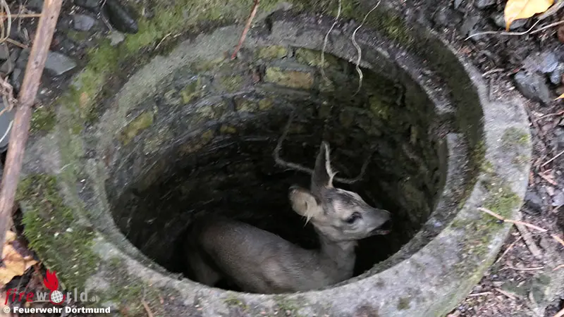 Durch laute Schreie des verunglückten Tieres wurde der Spaziergänger auf das Tier aufmerksam und entdeckte es abseits des Weges in einem nicht abgedeckten Schacht. Er wählte den Notruf der Feuerwehr und die Leitstelle der Feuerwehr Dortmund alarmierte umgehend ein Fahrzeug zur genannten Adresse. Vor Ort wurden die Feuerwehrleute vom Anrufer zu dem verunglückten Reh geführt. Da der Schacht nicht sehr tief war, konnten zwei Feuerwehrleute das Reh packen und aus seiner Zwangslage befreien.