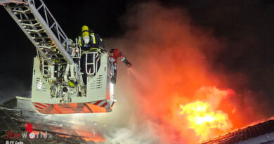 Die Rauchentwicklung war für die Kräfte der Feuerwachen Mitte (Wache 1), Altenessen (Wache 4) und Stadthafen (Wache 3) deutlich zu sehen und wies Ihnen den Weg. Vor Ort bestand die größte Herausforderung darin, ein Übergreifen des Feuers auf den direkt angrenzenden, etwa 6.000 Quadratmeter großen Hallenkomplex zu verhindern. Das gelang, nachdem die Löschwasserversorgung, von der Altenessener Straße kommend, aufgebaut war.