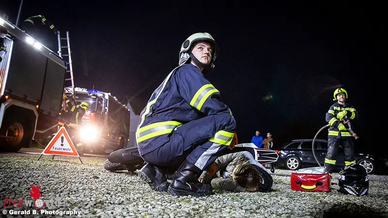 Oö: Unfall- und Branddienstübung mit Blackout-Einlage in Moosbach