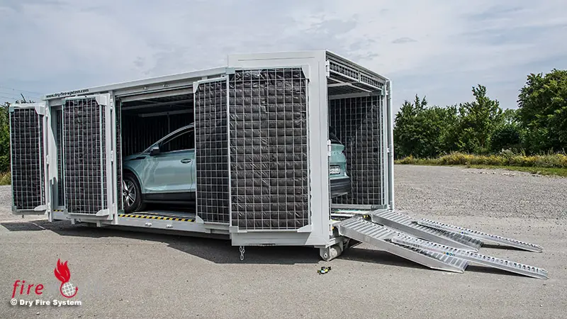 Dry Fire System ist eine neue Entwicklung in Hinblick auf das Löschen von Elektrofahrzeugen. Entgegen bisheriger Methoden kommt hier ein Granulat in einem Container zum Einsatz. Es erlaubt sowohl die vorbeugende Quarantäne (ohne dass der Wirkstoff dann verbraucht wird), jedoch auch die aktive Einbringung eines Problemfahrzeuges nach einem Brand der Akkus.