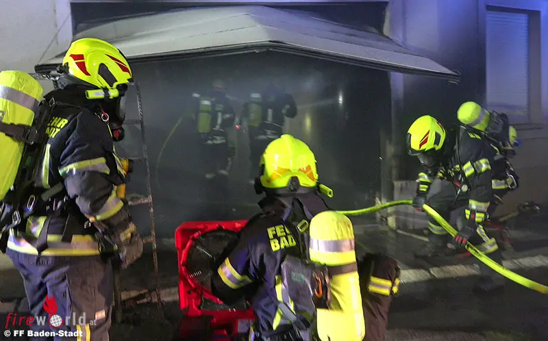 BADEN (NÖ): Die Freiwillige Feuerwehr Baden-Stadt wurde am 10. Oktober 2021 um 20:59 Uhr von der Feuerwehr-Bezirksalarmzentrale Baden zu einem Brand in einer Garage mit starker Rauchentwicklung alarmiert. Zuvor vernahm ein Passant noch einen lauten Knall und wählte den Feuerwehrnotruf 122.