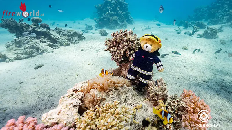 Gemeinsam mit Feuerwehrmann Werner Kerschbaummayr war der kleine Feuerwehrbär im ägyptischen Hurghada am Roten Meer. Von dort aus schipperten die beiden auf der „MY Blue“ zu den schönsten Tauchplätzen des Landes, „Brothers“, „Daedalus“ und „Elphinstone“.