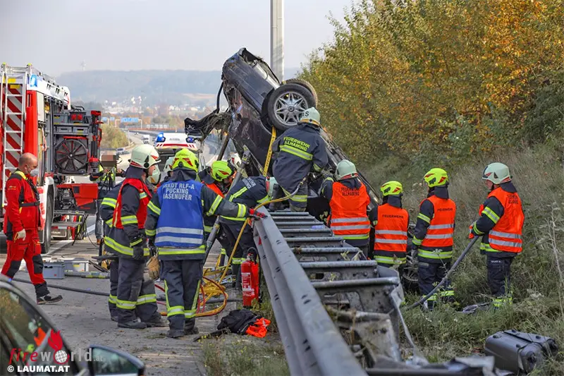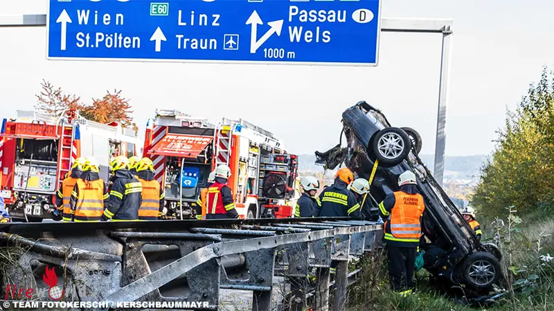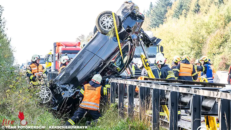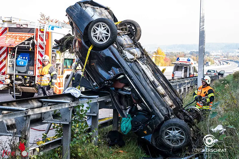Ein schwerer Verkehrsunfall hat sich Mittwochmittag auf der Westautobahn bei Pucking (Bezirk Linz-Land) ereignet. Ein Pkw wurde über die Leitschiene geschleudert und kam senkrecht zum Stillstand.
