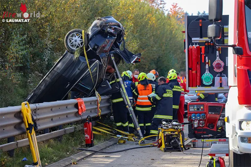 Der PKW kam dann in senkrechter Position an der Leitschiene lehnend zum Stillstand, der Lenker war eingeklemmt. Die Einsatzkräfte der zwei alarmierten Feuerwehren mussten den Eingeklemmten unter Einsatz mehrerer Bergescheren aus dem Unfallwrack schneiden.