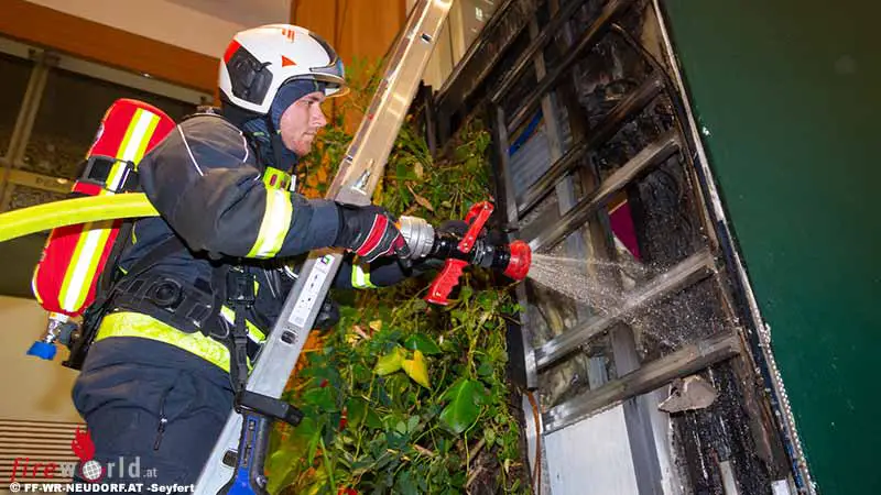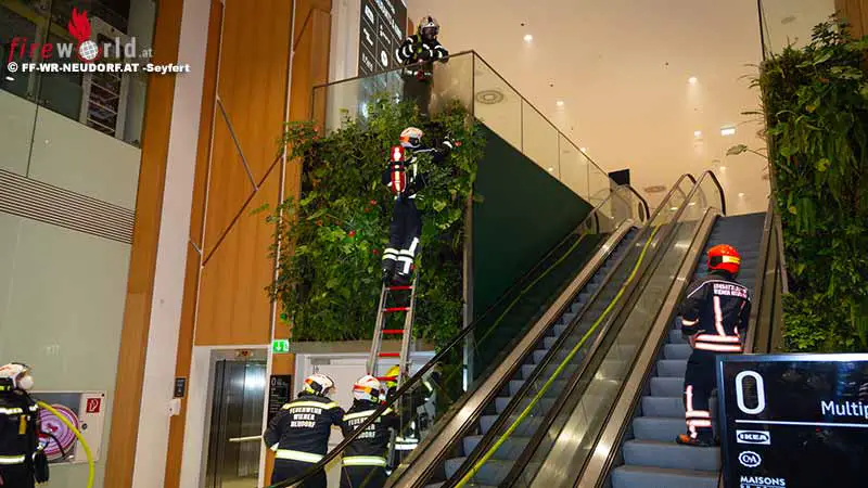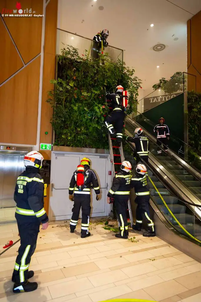 WIENER NEUDORF (NÖ): In der Nacht auf Donnerstag, 4. November 2021, kam es in einem Einkaufszentrum zu einem Brand, der von der Freiwilligen Feuerwehr Wiener Neudorf (Bezirk Mödling) rasch unter Kontrolle gebracht werden konnte. Kurz nach Mitternacht war hinter einer vertikalen Wandbepflanzung ein Brand ausgebrochen.