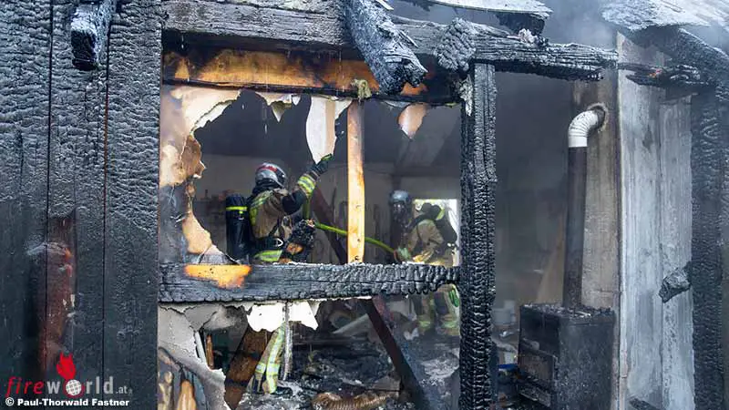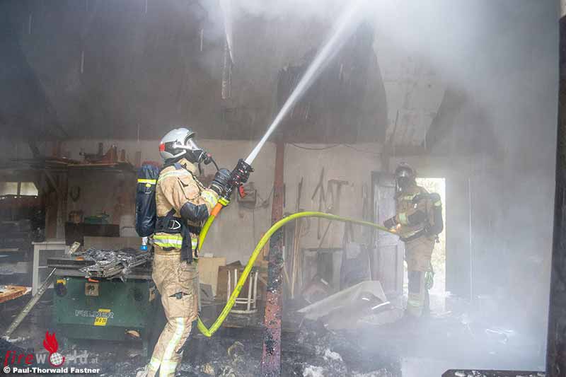 Im Zuge der Erkundung konnte ein ungefähr 50 Quadratmeter großer Schuppen, der als Werkstatt genutzt wird, in Vollbrand vorgefunden werden. Wegen der hohen Brandintensität begannen auch bereits umliegenden Bäume zu brennen. Glücklicherweise befand sich zum Zeitpunkt des Brandausbruches niemand im Gebäude.