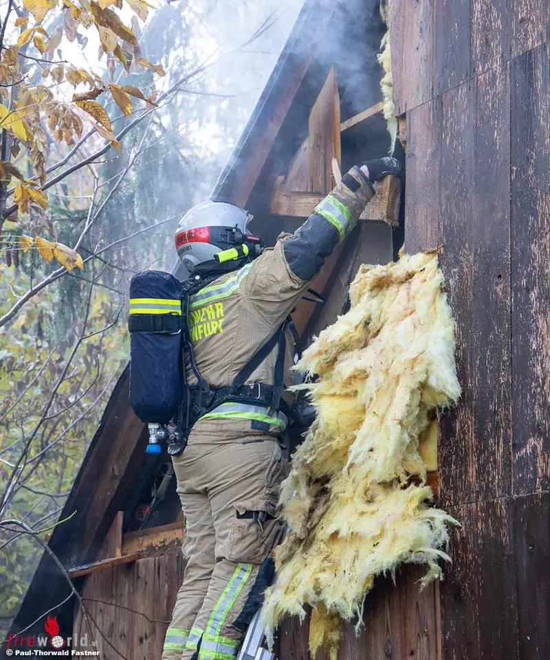 Um den Brand restlos zu löschen war es notwendig, Teile des Daches und der Fassade mittels Motorkettensäge und Einreißhaken zu öffnen. Bereits 45 Minuten nach der Alarmierung konnte „Brand aus“ gemeldet werden. Die aufwendigen Nachlöscharbeiten dauerten noch über eine Stunde an. Der Schuppen wurde durch den Brand vollständig zerstört.
