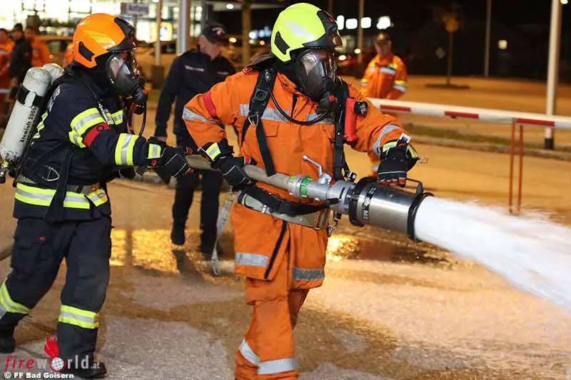 Nach dem Angriffsbefehl setzten die Feuerwehrmänner dann die erforderlichen Maßnahmen: Vom Löschangriff mit dem Strahlrohr oder Schaum unter Atemschutzausrüstung, dem Absichern der Einsatzstelle oder dem Aufbau des Hochleistungslüfters, bis hin zu richtigen Funkmeldungen und dem Aufbau der Wasserversorgung von einem Hydranten reichten die Aufgaben.