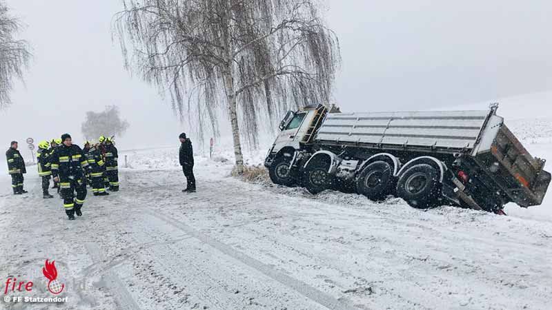 Beim Einrücken in das Feuerwehrhaus bemerkte die Besatzung des HLF 3 einen Lkw-Unfall an der L100. Sofort wurde die Unfallstelle abgesichert und das bereits eingerückte Rüstlöschfahrzeug nachgefordert. Nach Rücksprache mit dem unverletzten Lenker des Fahrzeuges wurde die Bergung gemeinsam mit den Kameraden der Feuerwehr Kuffern vorbereitet.