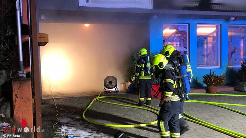 In der Garage einer Firma mit angrenzendem Wohnhaus entstand aus noch ungeklärter Ursache ein Schwellbrand mit starker Rauchentwicklung. Durch den Brandgeruch wurden die Hausbewohner geweckt und meldeten den Brand bei Florian Niederösterreich. Bereits auf der Anfahrt der beiden vollbesetzten Tankwägen der Feuerwehr Retz konnten schon die ersten Maßnahmen zu einer schnellen Brandbekämpfung eingeleitet werden.