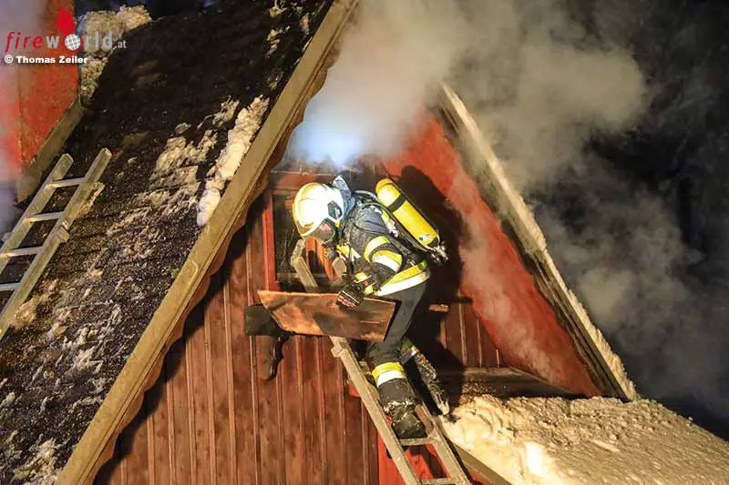 Um an den Brandherd zu gelangen, wurde zeitgleich das Dach mittels Motorsägen, Äxten und Einreißhaken geöffnet und mit einem Außenangriff begonnen, so Sulzer weiter.