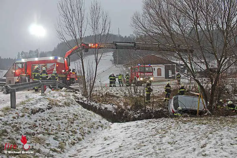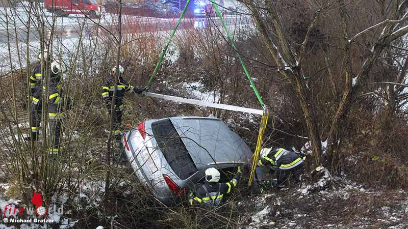 EMPERSDORF (STMK): Auf der B73 kam am Morgen des 5. Dezember 2021 im Ortsgebiet von Empersdorf ein Fahrzeug von der Fahrbahn ab und landete in einem Bach. Verletzt wurde beim Unfall niemand. Das Unfallfahrzeug wurde mit Hilfe von Kran und Seilwinde geborgen.